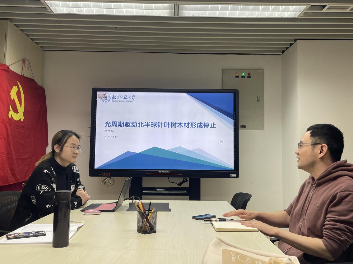 牟文焕同学的汇报的题目为“光周期驱动北半球针叶树木材形成停止”,她的研究主要收集并创建了北半球(25°-55°N)针叶树种木材形成结束的数据集,利用线性混合效应模型发现,木材形成结束主要受光周期的驱动。通过对北半球针叶树木材形成结束的空间规律及影响因素的研究,有利于更加精确地预测全球气候变化下的木质部物候,从而利于陆地森林生产力和碳收支的有效评估。汇报完毕,在场人员积极讨论,有同学对于木材形成开始的“遗留效应”提出疑问,也有同学对于光周期是木材形成停止的主要因素提出疑问,牟文焕同学一一进行解答,和在场人员展开了热烈讨论。