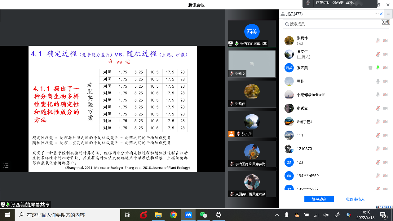 本次报告围绕多种环境变化和管理措施下我国北方农牧交错带土壤微生物多样性的维持机制,系统介绍了张西美研究员取得的系列成果:揭示氮肥施用对北方农牧交错带土壤微生物群落的影响最大;鉴定植物生产力与微生物功能多样性之间的紧密关系;发现中度干扰与资源生态位的结合对维持微生物多样性的重要性;从分子层面揭示微生物对气候变暖的正反馈方向和机理;发现全球变化因子、生态过程、微生物群落成分之间存在的特定对应关系。