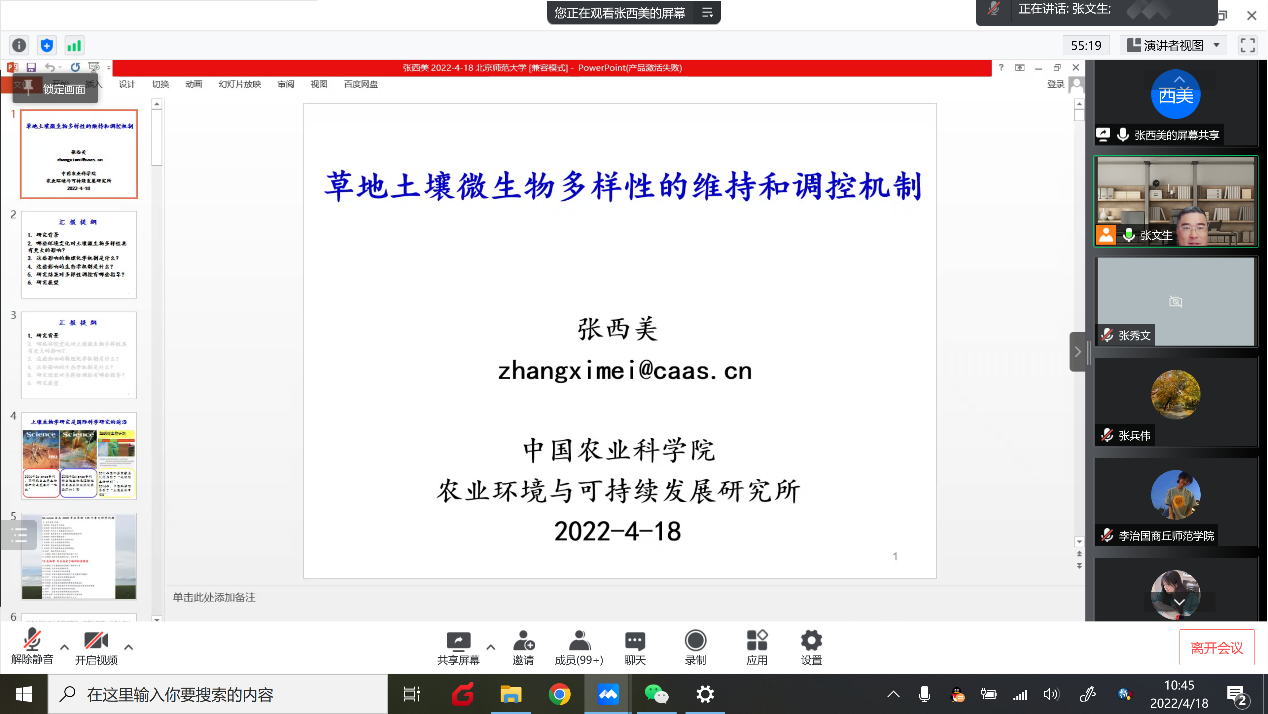 2022年4月18日上午,2022年第1期资源科学前沿系列讲座成功举办。此次讲座通过线上会议的形式进行,邀请了中国农业科学院农业环境与可持续发展研究所张西美研究员。报告题目为“草地土壤微生物多样性的维持和调控机制”。讲座由张文生教授主持,线上约500名师生参加。