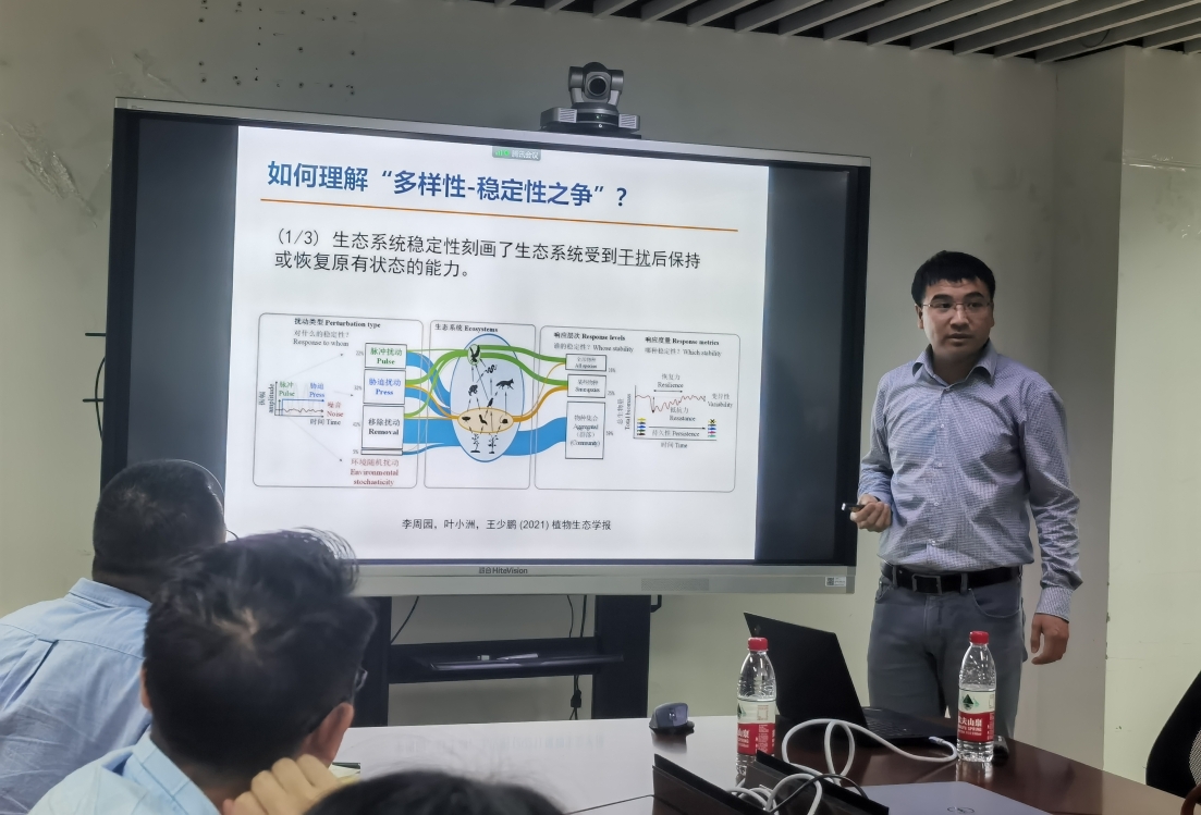王少鹏研究员从生态系统稳定性及其与生物多样性的关系出发,围绕以下三部分内容进行报告。第一部分,他介绍了生态系统多尺度稳定性的内涵以及稳定性的空间分解框架,并结合该理论方法的应用案例进行了讲解。第二部分,他进一步结合生物多样性能否促进生态系统稳定性这一争议焦点,介绍了最近几项基于生物多样性实验开展的理论实证研究,分析了多维度框架下的多样性-稳定性关系,认为生物同质化会削弱生态系统的稳定性。最后,他介绍了生态系统功能与稳定性关系的研究进展,指出生态系统功能和稳定性可呈正或负关系,并探讨了在生态系统管理中的应用。