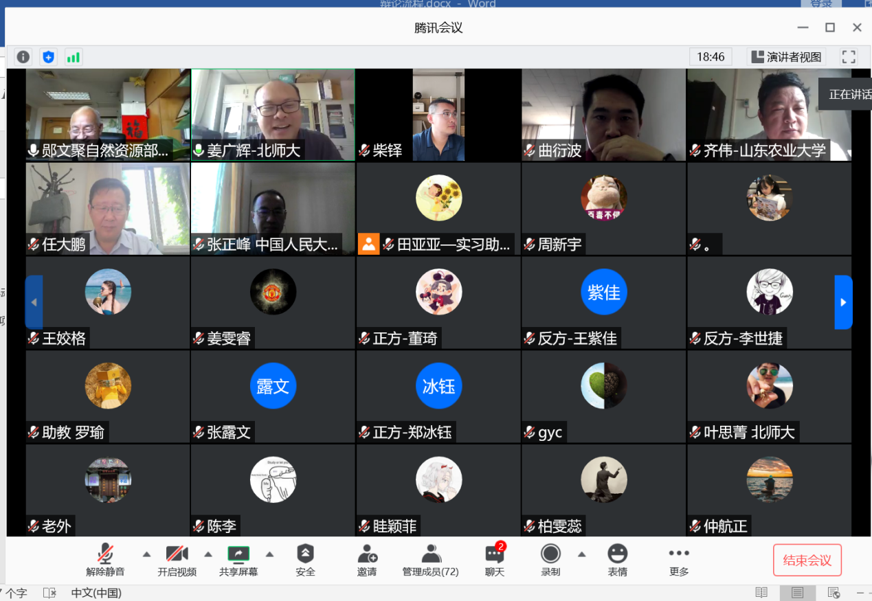 7月5日,2017级资源环境科学专业土地资源方向线上实习正式开始。为提高同学们的逻辑思维能力与合作能力,激发同学们对土地资源管理相关的社会热点的思考,2020年07月07日,自然资源学院与学院优秀青年人才委员会共同主办了主题为“合村并居的是与非”的辩论赛。比赛在腾讯会议直播间线上直播的形式进行。本次辩论赛邀请了自然资源部国土整治中心郧文聚研究员、中国农业大学任大鹏教授、张凤荣教授,山东农业大学齐伟教授、武汉大学桂华教授、中国人民大学张正峰教授、山东财经大学曲衍波教授、中央财经大学柴铎副教授七位老师担任点评嘉宾。