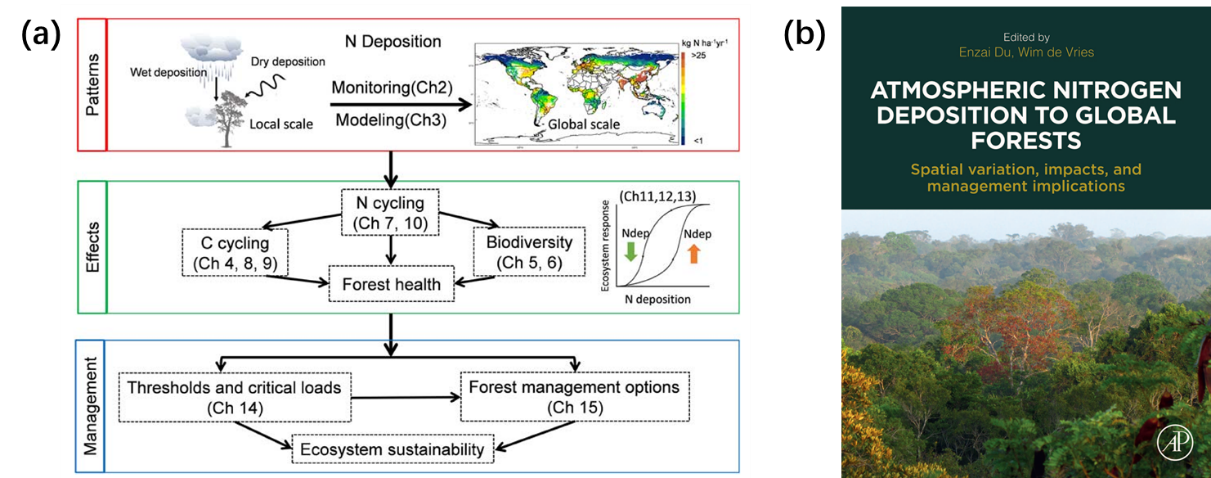 地理科学学部杜恩在教授与瓦赫宁根大学Wim de Vries教授组织相关领域国际知名学者从(1)全球森林氮沉降监测与模拟、(2)氮沉降增加的生态与生物地球化学效应、(3)森林生态系统对氮沉降削减的响应以及(4)高量氮沉降背景下森林生态系统管理等四方面撰写了16个章节的评估报告(图1a),近期以《Atmospheric Nitrogen Deposition to Global Forests: Spatial Variation, Impacts, and Management Implications》为题在美国学术出版社(Academic Press)出版(图1b)。本书历时3年时间,对全球森林氮沉降格局及其生态效应最新研究进展进行了系统梳理,为林业科学、生物保护、全球变化、环境管理等相关领域的学者、研究生及政策制定者提供了重要的专业参考资料。