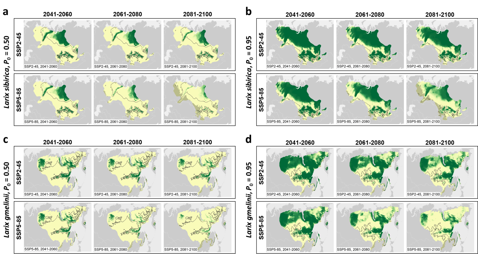 进一步将拟合模型应用于多情境的CMIP6气候预测数据,发现Larix sibirica和L. gmelinii生长对升温表现出负响应的分布将大幅度向高纬度和高海拔方向扩展(图4)。从生物地理学视角看,这很可能成为地球历史上“北极-高山间断分布”形成过程的当代再现。