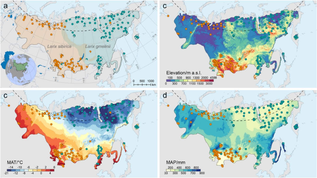 图1. 欧亚大陆北方寒温性落叶松林分布区与研究采样种群