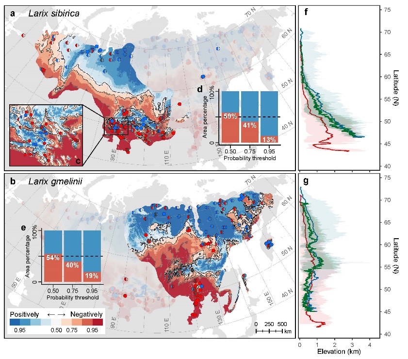 落叶松树木生长对温度的负响应具有明显的生物地理格局,其出现概率随纬度和海拔的升高而降低(图3)。以0.95为阈值概率,对温度变化表现出显著负相关的Larix sibirica和L. gmelinii种群分别约占其分布区面积的13%和19%;阈值放宽至0.50,这一比例将分别高达59%和54%。
