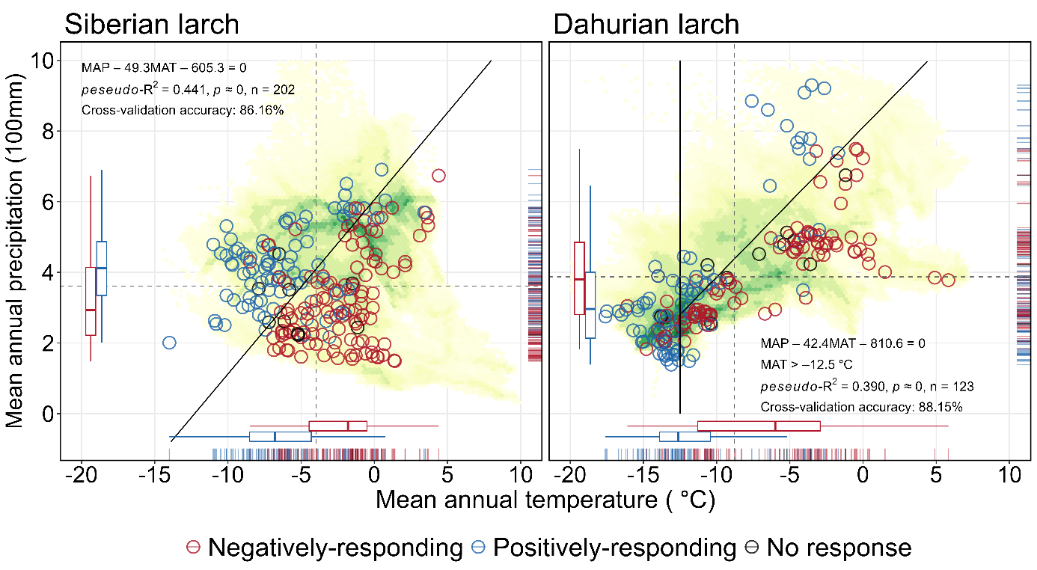 无论是Larix sibirica还是L. gmelinii,其分布区范围内生长-气温关系特征均随当地气候条件的变化而变化。总体表现为,年降水量和年均温以低于42.4-49.3 mm/°C的比率变化,树木径向生长更趋向于与温度变化表现出负相关关系(图2)。