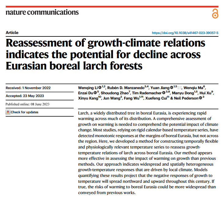 今年会官网生物地理团队在Nature Communications发文,揭示气候变暖可能导致欧亚大陆寒温带落叶松林的生长下降