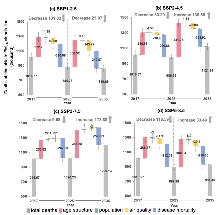 黄庆旭副教授团队在《自然·通讯》在线刊出了题为“The challenge of population aging for mitigating deaths from PM2.5 air pollution in China”的研究成果,该论文研究了不同发展情景下2000至2035年中国因PM2.5空气污染导致的死亡变化,揭示了中国当前面临的人口老龄化挑战对降低PM2.5污染导致的死亡人数(deaths attributable to PM2.5 air pollution, DAPP)有着关键影响。